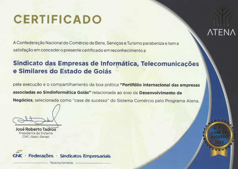 O Sindicato das Empresas de Informática, Telecomunicações e Similares do Estado de Goiás (Sindinformática Goiás) foi reconhecido nacionalmente pela Confederação Nacional do Comércio de Bens, Serviços e Turismo (CNC) no Programa Atena de Boas Práticas do Sistema Comércio.